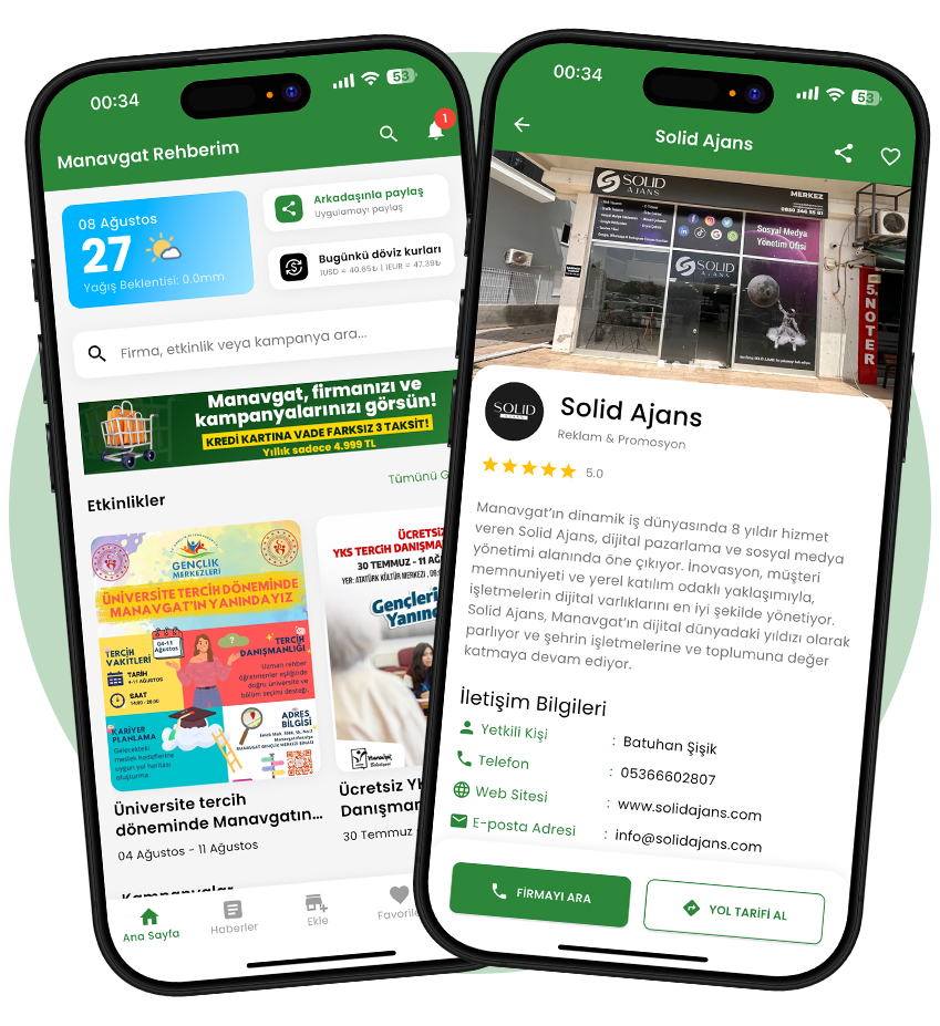 Manavgat Rehberim, şehirdeki tüm işletmeleri, etkinlikleri, kampanyaları, nöbetçi eczaneleri ve daha fazlasını tek bir uygulamada toplar. Kullanıcılar aradıkları bilgiye saniyeler içinde ulaşırken, işletmeler de hedef kitlesine kolayca erişir.